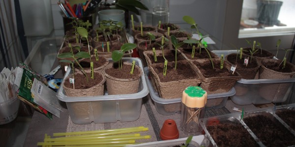 Olen vihdoinkin saanut kaikki rehusysteemit järjestykseen, ja mieli siis lepää. Muutamat siemenet olivat lähteneet niin hyvin itämään, että oli pakko siirtää ne turveruukkuihin jatkamaan kasvuaan. Toivottavasti ne jatkavat kasvuaan! Suurimmat taimet seuraavassa kuvassa ovat kurkkujen taimia.