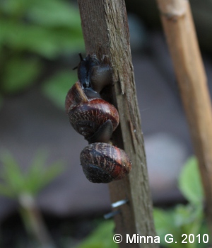 Tämä ei ole ihastuttava näky sinänsä koska kyse on lehtokotiloista. Olisin tyytyväisempi ilman näitä nilviäisiä 😀 Mutta kesä tulee ei voi mitään… kuvassa emokotilo raahaa poikastaan.