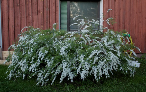 Täydessä kukassa on myös agervot tontin reunamalta. Tämä on ilmeisesti virpiangervo.