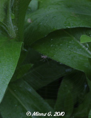 Vuorikaunokin lehtien seasta löytyi hämähäkki kutomassa verkkoaan. Oikeanpuoleinen kuva on rimppakinttuisesta daaliasta, jonka istutin tuohon puukehikkoon.