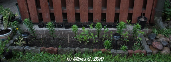 Jos oikein tarkasti katsot, niin näet tuossa aidan edustalla liljojen takana tuollaisen taimirivin. Ne ovat auringonkukkia. Tein vielä heräteostoksia viime viikolla, ja ostin jonkun auringonkukkasiemenpussin, mistä pitäisi kasvaa sellaisia eri värisiä versioita. Esimerkiksi, joillakin kukinto olisi oranssi. Saas nähdä mitä niistäkin tulee. Tuossa on nyt joitakin taimia koulittuina ja istutukseen menevät saman tien kun ovat tarpeeksi suuria 🙂 Kuvan vasemmassa reunassa näkyy ruukku, joka tulee vielä parvekkeelleni lähiaikoina. Siinä on istutettuna myskimalva, ja tarkoituksena on lisätä vielä parit matalat akileijat (Biedermeister-lajike).
