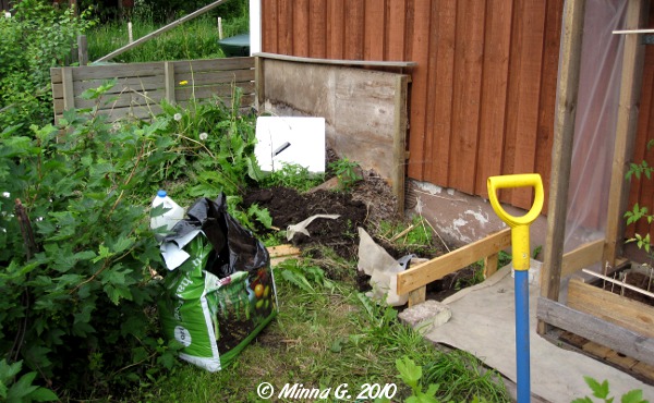 Vanha komposti on vielä kitkemättä, mutta toivon saavani sen tehtyä tässä junannuksen tienoilla. En aio siirrellä multia siitä mihinkään, jollei ole pakko. Ajattelin istuttaa siihen jotakin kukkasekoitusta, että jos siihen sellainen pääsisi kasvamaan vielä tämän kesän iloksi.