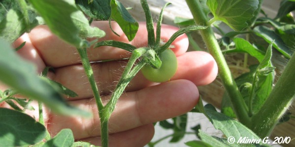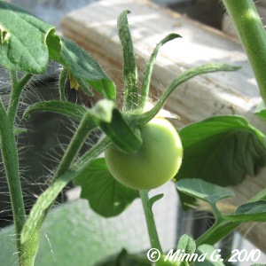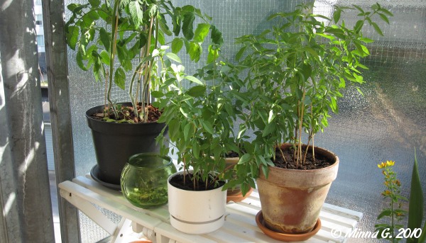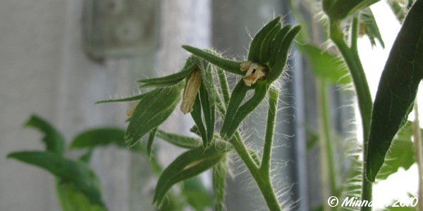 Blagovest F1-tomaatti on kukkinut jo jonkin aikaa, mutta epäilen, että sitä vaivaa jokin tauti. Sen lehdet ovat ihan laikukkaat ja kukat eivät oikein tahdo kehittyä tomaateiksi. Vaihdoin tänään kaikki mahdolliset tukinarut sukkahousuversioihin. Huomasin, että alin naru oli vahingoittanut runkoa jonkin verran. Toivottavasti tomsku ei nyt kuole tuohon! Olen myös joutunut sumuttelemaan tomaatin multaa mäntysuopaliuoksella, koska sinne on pesiytynyt pikkukärpäsiä jonkin verran. Joutunee keksimään jonkin toisen keinon kohta, esim vesilasin, ettei juuret vahingoitu suopaliuoksesta.