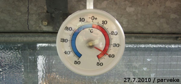 Otin kuvan juuri äsken, noin viisi minuuttia sitten noin kello 16. Lähes saman verran lämpöä on tässä tietokoneen äärellä! Lämpöä siis riittää vaikka sivuseinustan lasit ovat avonaiset. Minulla on siihen rakenteilla kehikot ötökkäverkoilla varustettuina, etteivät kissani pompi siitä sitten pihalle, kunhan saan ne kotiin (ovat vanhempieni talolla hoidossa pahimman kuumuuden ajan).