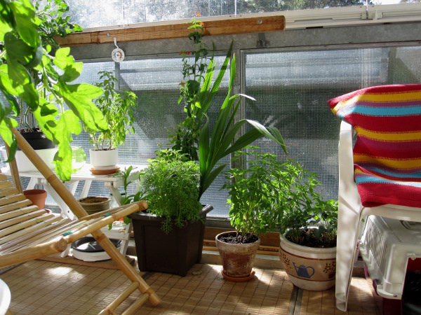 Jouduin myös siirtämään parveketomaatin vierestä toisen basilikan lattialle. Se näyttää viihtyvän nyt paremmin kun ei ole täysin lasissa kiinni koko ajan. Basilikan vieressä on padassa akileija, jonka jouduin leikkaamaan alas noin kuukausi sitten. Ihmettelinkin miksi se ei oikein tykännyt olla siinä padassa, niin pataanhan olikin alkanut jostakin kasvaa sireeni 😀 Ei ihme, että akileija kärsi. Sireeni oli ilmeisesti tullut pihamaalta mukaan mistä akileijatkin ovat kotoisin. Toivottavasti saan tämän padallisen talvehtimaan, samoin pikkulajikkeen, joka kasvaa toisessa padassa.