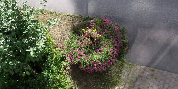 Talon asukkaat ovat erittäin aktiivisia kesäisin pihamaan suhteen. He ovat laittaneet pihamaata jo useamman vuoden, ja näkymä alkaa olla jo silmiä hivelevää 🙂 Näen tämän lähes saman kauneuden tässä tietokoneellanikin istuen, koska ikkuna on samaan suuntaan… itse asiassa kukkapenkki näkyy lähes kokonaisuudessaan tähän, jossa istun nyt! Parvekkeelta otetussa kuvassa se jää hieman tuonne taka-alalle pusikoiden taakse.