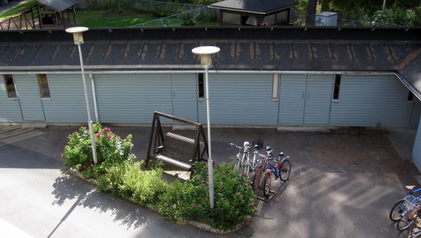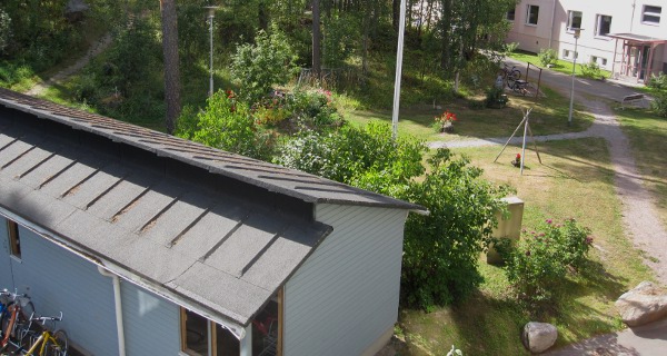Vasemmassa yläkulmassa näkyy heikohkosti polku, joka menee metsän läpi. Ihmiset käyvät siellä taluttelemassa lemmikkejään – kissoja ja koiria. Tuon varastorakennuksen toisella puolella on toinen keinu sekä sinne on laitettu kesäkalusteita. Käyn napsasemassa siitä kuvia kunhan kerkeän.