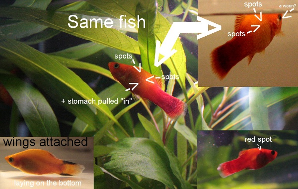 Tässä kuva siitä kuolevasta platystä… se oli oikein pulskea vielä pari viikkoa sitten. Luulin, että loishäätö olisi tehnyt sille hyvää. Kuva on otettu 6.1.2011
