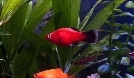 Kävin ostamassa kaupasta aikanaan kaksi tummemman punaista platyä, kun ne olivat mielestäni todella kauniin värisiä. Akvan lamppu myös korostaa punasävyisiä kaloja. Toinen oli koiras ja toinen naaras. Koiraat olivat tuolla pienemmässä tankissa, niin kuin jo mainitsinkin, ja naaras tässä suuremmassa. Koiras kuoli vissiin kuukausi sen jälkeen kun olin sen hankkinut ja naaras on tuolla heittämässä henkeään parasta aikaa. Koirasten kohtaloksi on saattanut koitua myös yksi toinen poika-platy, joka oli altaassa hetken aikaa. Olen yrittänyt lueskella kaiken näköisiä käyttäytymismalleja noille fisuille, mutta en ole kyllä törmännyt sellaiseen artikkeliin vielää, jossa kerrottaisiin, että koiras-platy tappaisi toiset kalat jahtaamalla… varsinkin jos ne muut platyt ovat myös koiraita. Onhan tuolla tankissa muitakin kaloja kuin platyt! Niin sanotussa ”ukkotankissa” saivat kyytiä muutkin kalat kuin platyt kun siellä oli kunnon kukkoilija-platykoiras! Sama ukko kerkes parittelemaan varmaan kaikkien naaraiden kanssa tuolla isommassa altaassa, ja jahtaamaan ne henkihieveriin, ennen kuin tajusin siirtää sen sieltä pois. Siirsin sen myös sillä tavoin, että se joutui olemaan jonkun aikaa yksinään platynä siellä pikkualtaassa. Sitten siirsin muita koiraita sinne jälkikäteen, jotka saivat myös kukkoilijalta kyytiä. Noh, ei siinä muu auttanut kuin pistää ukko ”ojennukseen”. Nyt altaassa on rauhallisempaa kun siellä on vain neljä itse kasvattamaani koiras-platyä… ne ovat vieläpä veljeksiä.