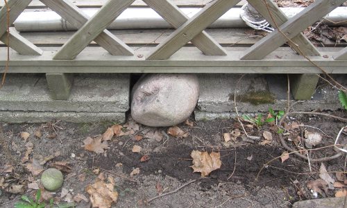 Jouduin tekemään joitakin viritelmiä pihamaalle… tässä on laitettu kivi blokkaamaan kullanmurun kaivaukset terassin alle. Foxilla on ilmeisesti valeraskaus, ja se yrittää kaivautua, ja on onnistunutkin kaivautumaan talon sivussa olevan terassin alle. koira joutui pesuun viikko sitten kuoppaa kaivaessaan… tai lähinnä vedellä huuhteluun. Kävin etsimässä sellaiset kivet terassin rakenteiden reunustoihin ettei koira saa niitä siitä siirrettyä.