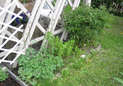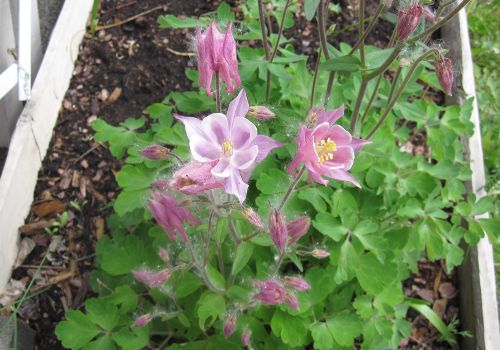 Kukkapenkin jatkeena on maahan istutettuja kasveja, joista vasemmanpuoleisena Akileijat (3kpl), keskellä taaimmaisena värililja (tumma viininpun.) ja edessä tarha-alpi, sekä kulmauksessa on pioni. Kaikki ovat lähteneet tänä vuonna todella hyvin kasvuun. Tarha-alpeja oli istutettu vain kolme kappaletta, ja ne ovat selkeästi tuplautuneet. Samoin värililjasta on juuressa näkyvillä muutama uusi taimi.