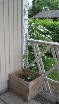 Viereisessä kuvassa on sukulaiseni rakentama kukkalaatikko. Tässä on muuten edullinen idea pihamaille: hanki köynnöstäviä kukkia varten puutarha-aitaa jota taittelemalla saa tehtyä pylvään.