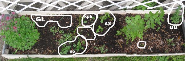 Äitini on antanut minulle etupihaltaan kukkapenkin, jota saan laittaa mieleni mukaan. Rakensin sen noin vuosi sitten. Tein kukkapenkille lautareunat ja pohjustin sen rikkaruohokankaalla. Istutin siihen vuosi takaperin pari perennaa, jotka sitten lähtivät ihan hyvin tänä vuonna kasvamaan. Vasemmassa laidassa vaaleanpunaisena kukkii Akileija. GL tarkoittaa tänä vuonna laittamiani gladioduksia, jotka eivät ole vielää nostaneet varsiaan. Kph on kaunopunahattu, jonka istutin nyt keväällä. So on sarviorvokki, as on kiinanasteri ja MM on mirrinminttu (ist viime vuonna). Kukkapenkissä on myös muita taimivaiheessa olevia kasveja esim kehäkukkaa. Kehäkukista tippui viime vuonna kukkapenkkiin valmiiksi siemeniä jotka nyt lähtivät itämään.