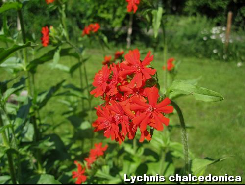 Palavarakkaus, Lychnis chalcedonica, on niin ikään tuontitavaraa naapurin villitontilta. Luoja miten kaunis tuo kukka on! Palavarakkautta on tarha-alpin ja myskimalvan kanssa samassa kukkapenkissä.