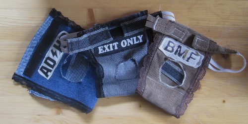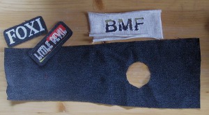 Päätarvikkeet: kangasta (esim. farkkua, samettia), kuminauhaa ja velcranauhaa. Itse käytin farkku- ja samettikangasta vanhoista housuista, jotka olivat menneet jo osittain rikki. Lisäksi kävin kangaskaupasta hakemassa koristenauhaa ja paikallisesta puljusta (T-Mafia) valmiiksi prässättyjä kangasmerkkejä. T-Mafiasta onnistui saamaan verkkokaupan valikoimaan kuuluvia printtejä valmiiksi prässättyinä trikookankaaseen, ja ei muuta kuin ompelemaan kiinni vain!