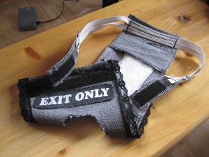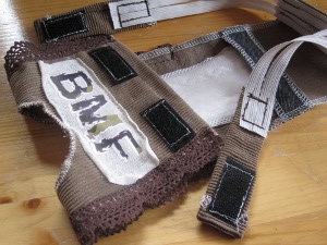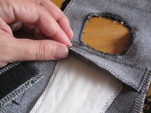 Seuraavista kuvista näkyy kuinka velcra ja kuminauhat ovat laitettuina paikoilleen.Velcralla on vastakappaleet hännän yläpuolella. Velcralle saa säätömahdollisuuden, kun laittaa sitä koko housun yläosan matkalta (harmaat pöksyt).