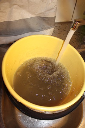 Kun likaiset astiat oli heitetty parvekkeelle, pääsin aloittamaan projektini hiekan pesusta. Laitoin noin kaksi litraa hiekkaa ämpäriin kullakin pesukerralla. Hiekka muuten pöllyää ihan kivasti, joten kannattaa laittaa ämpäri ensiksi puolilleen vettä ennen kuin sinne lisää hiekan… sillä välttyy pahimmalta hiekkapilveltä. Huuhtelin niin kauan kunnes huuhteluvesi oli lähes kirkasta. Hiekkojen huuhtomiseen sai kulutettua noin kaksi tuntia aikaa.
