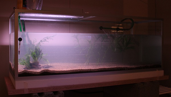 Otin pumpun suoraan sellaisenaan vanhasta akvaariosta, jotta sama bakteerikanta säilyisi. Ajattelin, että kalatkin tykkäisivät siitä myös, ja siten saan hoidettua akvojen vaihtoprojektin ilman, että minun tarvitsee erikseen sen kummemmin kypsytellä uutta akvaa. Osa vanhan akvaarion vedestä on myös tuossa altaassa, noin 20 litraa.