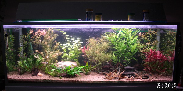 Tarkoituksena on vielä luovuttaa osa kasveista tuttavalle, kun ne eivät kaikki mahdu tuonne omaani. Sain häneltä tuossa akvassa komeilevan kepakon, joka on kuulemma villiomenapuun oksa. Virittelin sen eilen paikoilleen, ja samalla karsin kasvistoa runsaalla kädellä. Akvaario näytti nimittäin melkoiselta pusikolta jonkin aika sitten… (3.1.2012)