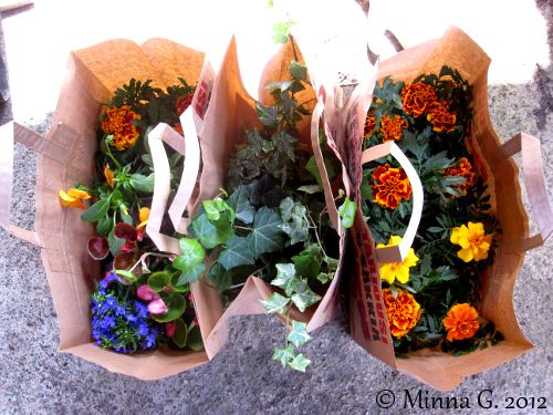 Kyllä ne kauppojen viherpihat ovat niin petollisia kuin olla ja voi! Tokmannille mennessä piti mennä ensinnäkin viherpihan läpi, että pääsi kauppaan sisälle, ja muita ulospääsyjäkään ei ollut, eli viherpihan läpi sisään ja ulos. Piha oli täynnä korkeita räkkejä, joissa oli erillaisia kesäkukkia, tarjouksena tietenkin… 5€/8 kukkasta. Mukaan lähti kaksi kassillista ihanaa väriloistoa ja kaksi murattia.