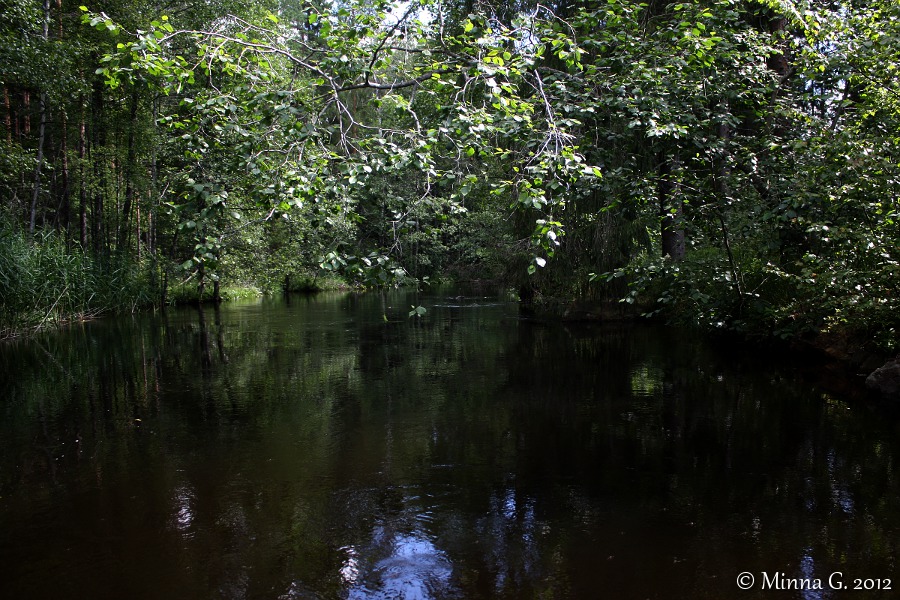 Oli aivan sama mihin suuntaan katsoi, kun vedenpinta kuhisi elämää. Oli vesikirppuja ja neidonkorentoja (Calopteryx virgo) silminkantamattomiin! Näin ehkä elämäni suurimmat sudenkorennot juuri tämän joen varrella. En edes löytänyt niistä tietoa korentowikistä.