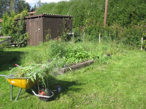 Joo, siellä se jossain rikkaruohojen keskellä komeilee… Seuraava vinkki: älä laita rikkaruohoja maatuvaan kompostiin, nimittäin, kaikki rikkaruohojen siemenet eivät maadu. Tuli sitten tämäkin oikein todettua oman käden kautta. Koska kangas rikkoutui pahan kerran, sen alta rehahti oikein kunnon rikkaruohoviidakko. Rikkaruohot saivat oikein hyvin vettä tänä vuonna kasvaakseen, ja siellä pesi ties mitä ötököitä!