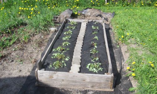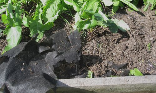 Talon isäntä auttoi multien kärräämisissä vanhasta kompostista, ja kun mullat olivat laatikossa, laitoin rikkaruohokankaan laatikkoon, ja keskelle painot pihakivistä. Nyt sitten, se huono idea: älä käytä rikkaruohokangasta, se hajoaa! Kuten kuvasta näkyy, jätin mansikkalootan tuollaiseksi, enkä siis laittanut mitään katetta tai muuta vastaavaa kankaan päälle.