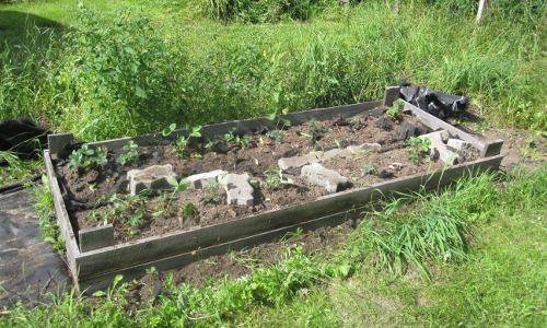 Tarkoitus on laittaa pihakivien alle laatikon reunaan saakka sanomalehteä, ja asetella pienempiä luonnonkiviä laatikon ja pihakivien väliin… ainakin toistaiseksi. Ehkä siihenkin tulee joskus parempi ratkaisu, kuten vaikka suuremmat pihalaatat. Mutta, nyt – näillä mennään.