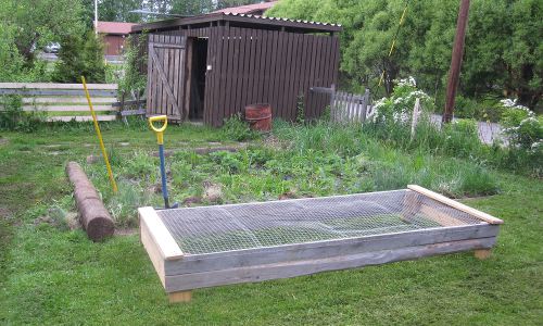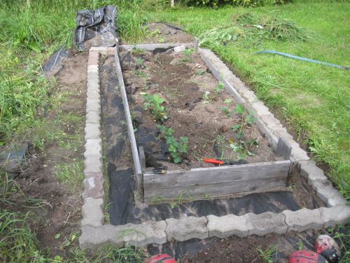 Kirjoitin aiemmin siitä, että olin keksinyt erittäin loistavan idean mansikkamaalle, ja nyt täytyy hieman korjailla tuota ”hyvää ideaa”. Eli, rakensin laatikon mansikoille, jotta saisin siihen jollakin tapaa viriteltyä puutarha-verkkoaidasta kannen, ja kanteen räksäverkon. Tämä sen takia, että linnut eivät pääsisi popsimaan mansikoita. Uskokaa tai älkää, mutta tämä on siis aloitettu vuosi sitten keväällä. Oli tarkoitus todellakin saada se valmiikksi vuonna 2011, mutta oli ilmeisesti taas kerätty itselle liikaa projekteja… kun helteet yllättivät, en jaksanut enää tuossa auringonpaahteessa paljon mitään tehdä.