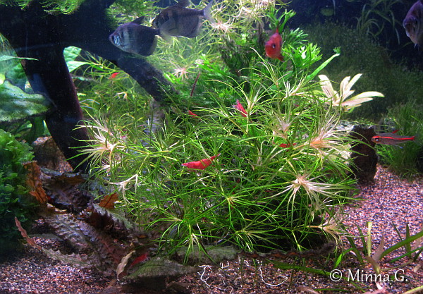 Kyseessä on Näkinruoho, Najas Conferta. Kun katsoo oikein tarkkaan, pusikosta voi nähdä tuollaisia punaisia ”otuksia”, jotka ovat Sakura sukarapuja. Sain niitä jo viime syksyllä tuttavaltani 9 kappaletta, mutta en nyt kyllä muista, olenko niistä täällä esim. maininnut mitään. Tuossa niitä nyt kuitenkin on, ja niitä on syntynyt altaaseen jo todella paljon… apua 😀