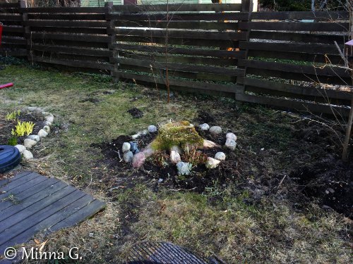 Tässä on sitten myös projektia kerrakseen, ja tämä on varmasti sellainen, jonka teen vastahakoisesti… nimittäin, talon kulmalla on aivan ihana muutaman vuoden ikäinen kanto, jonka joudun kaivamaan nyt sitten ylös kuitenkin. Kanto on todella kaunis, mutta se on vain tiellä 🙁 Olen sitä yrittänyt pitää tuossa monta vuotta ja keksiä sille selityksiä, mihin sitä tarvitsen, mutta on siitä luovuttava perhana! Tilalle sitten nurmikkoa, ja nuo kasvit tuosta pääsee uuteen kukkapenkkiin.