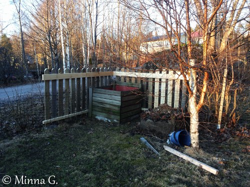 Onneksi sukulaismies on näppärä käsistään, ja hän oli rakentanut pyynnöstäni aidanpätkät kulmausta varten. Tarkoitus on, että aidanpalaset kestävät itsestään pystyssä. Päätin kuitenkin vielä siirtää pihakompostin kulmaukseen, johon se näyttikin sopivan kuin naula arkkuun 🙂