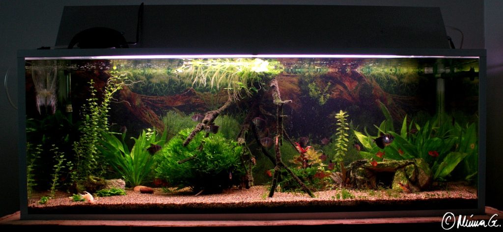 Toinen asia, joka vaikuttaa melkoisesti akvaarion kuntoon on ulkoa tuleva auringonvalo. Muutin tähän kämppään lokakuussa, ja aurinko paistoi aivan eri kulmasta asuntooni (jos edes missään vaiheessa paistoi syksyllä), mitä tällä hetkellä. Itse asiassa, tammikuun puolessa välissä aurinko paistaa aamulla ensimmäisenä akvaariooni! Tämä tietty aiheutti hieman leväongelmia… viherlevät hieman pääsivät valloilleen. Onneksi tupsulevää ei ihan älyttömästi ole ilmaantunut. On kuitenkin syytä varmaan rapsuttaa levä jotenkin pois omenapuunoksasta, joka tuossa akvaarion keskellä ”komeilee”. Leävongelma on myös omasta laiskuudesta osittain kiinni. Kun akvan joutui taas kasaamaan muuton yhteydessä uudelleen, tasapainoa joutui hieman hakemaan. Vedenvaihdot pitäisi suorittaa vähän tiheämmin yms. Pitää siis skarpata vähän!