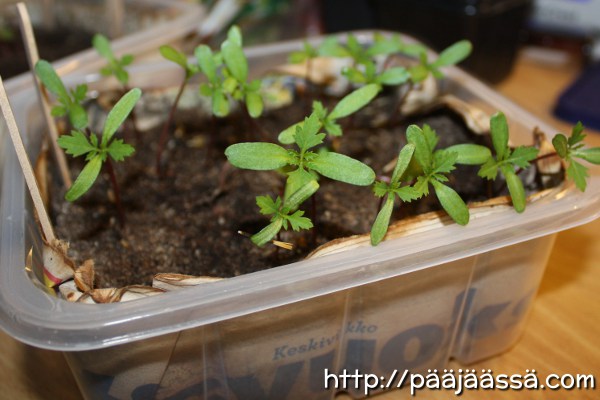 Samettikukkien ohjeessa sanotaan, että kukat pitää koulia noin kolme viikkoa siitä, kun ne ovat laitettu itämään. Taimet itivät noin kolme päivää. En tiedä onko tämä jonkinlainen ennätys, mutta muistan kyllä, että niihin olisi mennyt kauemmin aikaa. Ne olivat muutoinkin todella tarkkoja kasvatettavia, kun niitä ei peitetä mullalla. Piti käydä välillä sumuttelemassa, ja ne oli pakko olla ”kuvun” alla, etteivät pääse kuivahtamaan. Samalla piti tarkkailla, ettei kylvös homehdu, eli niitä piti tuuletella aika ajoin. Ja kun lehtiä on vihdoinkin yhdessä varressa neljä, taimet voi koulia.