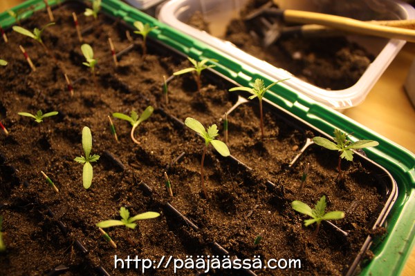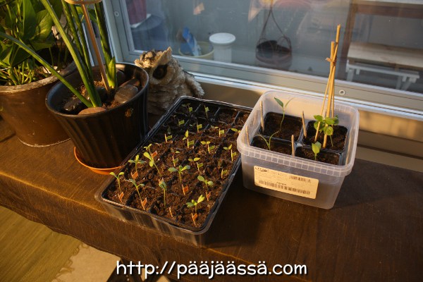 Tänä vuonna kevät ja talvi ovat olleet aivan outoja. Talvella ei oikein ollut lunta, ja kevät on todella pitkällä menossa, noin kuukautta aikaisemmassa, kuin normaalisti. Parvekkeellakin voisi olla jo päivällä viettämässä aikaa, ainakin aurinkoisella säällä. Kun kevät on omituinen, ajatusmaailma menee vähän sekaisin. Tarkoitan tällä sitä, että taimien kasvaminen vaikuttaa paljon hitaammalta kun ei ole lunta enää ollut maassa sitten maaliskuun lopun. Ihan normaalisti kaikki kasvaa kuitenkin. Sitä jotenkin ajattelee, että ne voi kohta jo ensi viikolla mennä istuttamaan tuonne ulos. Sehän ei todellakaan ole mahdollista, paleltuvat reppanat vielä. Ja toisinaan sitä miettii, onko tässä kaikessa edes mitään järkeä. Sain upotettua tänäänkin lähes koko päivän taimien huoltamiseen, miinus tietty koiran lenkitykset ja ruoanlaitto. Toivottavasti nyt tänäkin vuonna kaikki onnistuu edes jotensakin 🙂