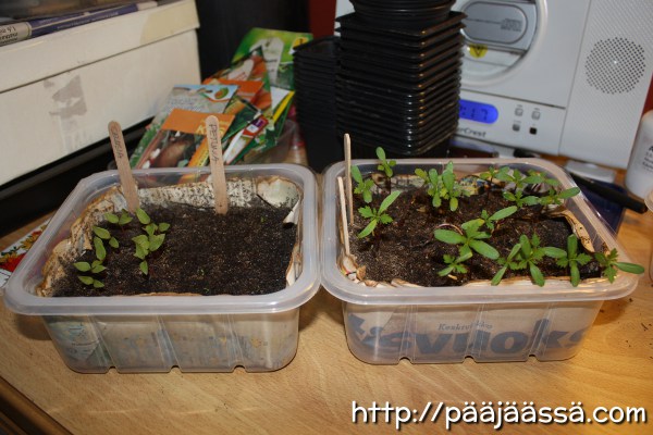 Kuten kuvasta näkyy (jos katsoo tarkkaan), että olen laittanut Pikarililjan (Celosia) ja Petunian samaan astiaan itämään, niin näin ei ole viisasta tehdä. Olen ollut suhteellisen laiska tämän kevään aikana ottamaan selvää, miten kasvit itävät, ja missä niiden pitäisi oikein kasvaa. Jouduin siis koulimaan Pikarililjan taimet tänään, ja Petunia on niin pientä vielä, ettei siihen todellakaan voi koskea. pitänee siis odotella vielä jokin aika. Oikeanpuoleisessa astiassa on kahta erillaista Samettikukkaa