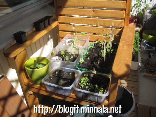 Toisella tuolilla on taimia ulkoilemassa…