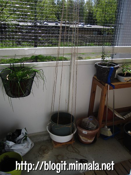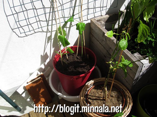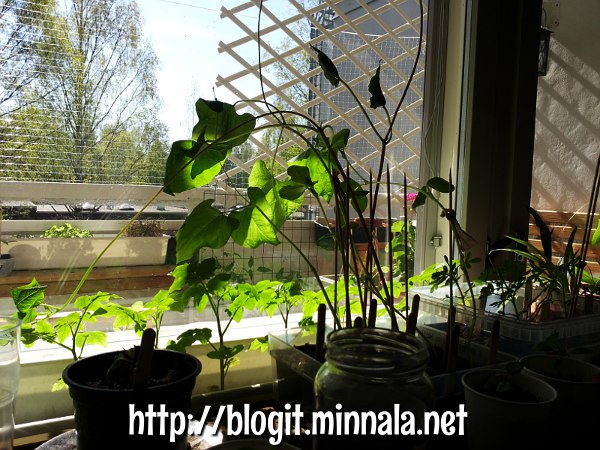 Mietin kyllä useaan otteeseen, viitsinkö mennä tuonne parvekkeelle heti aamupäivästä touhuamaan, mutta pavut näyttivät jo siltä, että ne kohta katkeavat, jollen tee niille jotain. Hetken touhuttuani, oli hyvä tulla vetämään sisätiloihin välipalaa ja kirjoittamaan blogia. Ei pala nahka sitten tuolla parvekkella ollessa (olen unohtanut ostaa aurinkovoidetta). Kun aurinko ei enää paista partsille, voi mennä sitten jatkamaan mihin jäi…