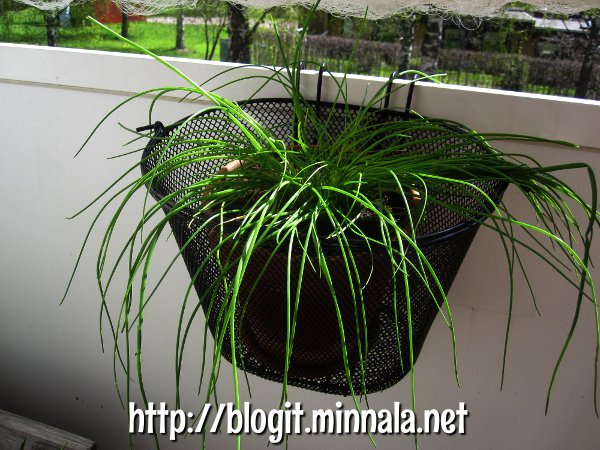 Kaupasta tartui mukaan tällainen polkupyörän tankoon laitettava kori, johon meinasin laittaa kyllä jotain muuta kukkasta kasvamaan, jotain sellaista, joka tulee noiden laitojen yli. Krassiahan minulla on tuossa amppelissa, mutta voihan sen ottaa sieltä alas ja laittaa tuohon. Kori olikin aika kätevä, kun sen sai tuohon parvekkeen reunaan helposti kiinni. Nyt siinä on väliaikaissäilytyksessä ruohosipuli, joka menee sitten toiseen paikkaan parvekkeelle, kunhan saan rompetta kerättyä pois.