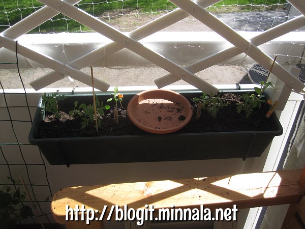 Laitoin yhteen parvekelaatikkoon matskut, mitä nyt tuossa noita taimia olen kasvatellut. Siinä on kahta erillaista samettikukkaa, oranssi/keltainen ja keltainen. Lootassa on myös uusi kokeilu, Cape Daisy. Ei hajuakaan millainen siitä tulee, mutta kokeillaan! Yritin siirtää kulmaukseen myös lobelian… tottakai se pienen pieni taimikko kippasi siitä taimilapion päältä nurin niskoin, että saas nyt nähdä selvisikö mikrotaimet siitä siirrosta 😀 Laatikon keskellä on toi savilautanen suojaamassa multaa, johon on tarkoitus laittaa kissoille kasvamaan nurmikkoa. Multaan on upotettu ruukku, ettei nurtsi lähde sitten karkuun noiden muiden kukkasten sekaan. Saattaa kyllä olla, että tuohon tulee laitettua vielä yhdet setit noita samettikukkia. Taimia kuitenkin riittää ja on varmasti ylimääräisiäkin.
