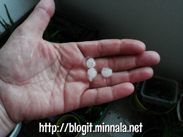 Kävin ukkosen jälkeen pihalla patsaselemassa, onko mitään tuhoja tullut… ei varsinaisesti mitään ihmeempää näkynyt, mutta rakeita oli tullut niin paljon, etteivät ne olleet ehtineet sulamaan edes puolessa tunnissa siitä, kun niiden sataminen loppui. Tässä videokuvaa niistä rakeista.
