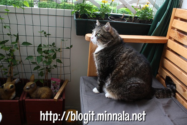 Spede nauttii parvekkeella… (kuva 13.6.2014) Pitää vissiin nosta tuo oikeanpuoleinen Clematis tuosta vähän ylemmäs jakkaralle, että pääsee valoon kiinni? Se ei ole oikeastaan kasvanut istuttamisen jälkeen. Toinen on sentään kivunnut valoon asti, ja tekee koko ajan uusia versoja. Joku ei nyt oiken natsaa :/