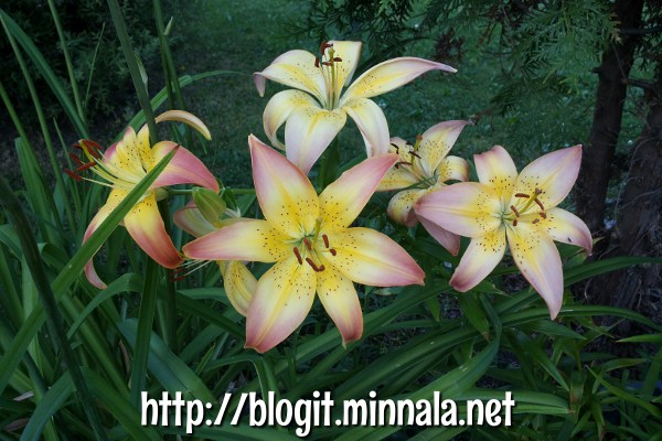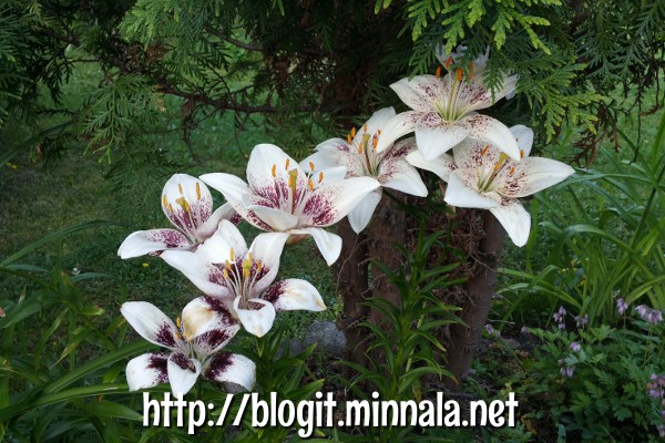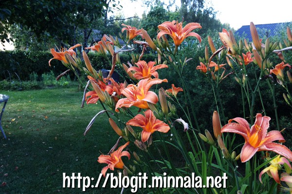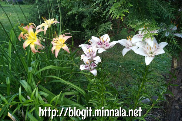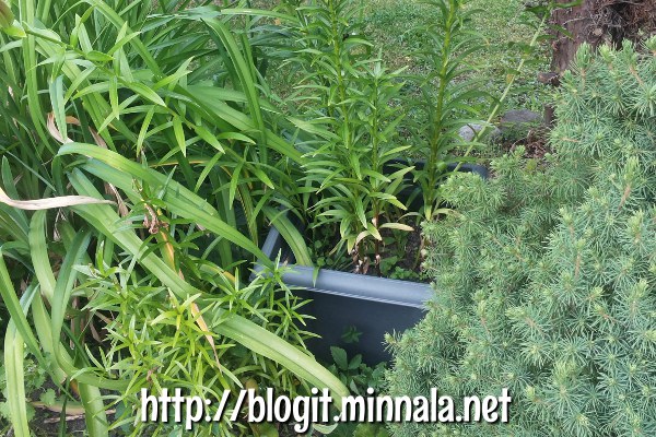 En ole ilmeisesti muistanut mainita mitään edelliseltä pihalta tonkimistani kukkasipuleista, että ne oli alunperin tarkoitus tuoda parvekkeelleni kasvamaan muoviruukkuun… laitoin nostaessani ne ruukkuun valmiiksi kaikkine kastematoineen, ja unohdin ruukun useammaksi päiväksi autoon etupenkin eteen paahtumaan. Liljat lähtivät kasvamaan aika hyvin, kun muistin välillä helleaallon sattuessa heittää niille vettä omasta juomapullostani 😀 Lopulta siirsin kukka-astian äitini etupihalle, jos vaikka siitä ottaisin sen joku päivä mukaan… kasvit jäivät sinne ja äitini kasteli niitä säännöllisesti. Siirsin astian jossain vaiheessa kuitenkin kukkapenkkiin, kun sinne jäi saneerauksen yhteydessä sopiva kolo, eikä parvekkeelleni olisi mahtunut enää yhtään ruukkua!