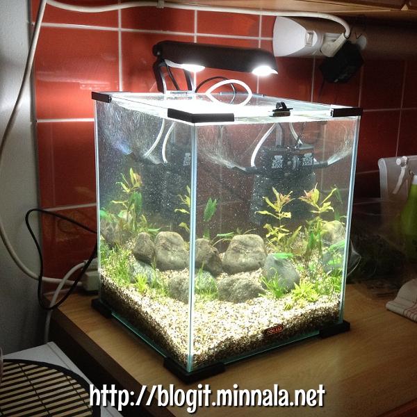 Nyt kävi sillä tavalla, että hankin itselleni nanoakvaarion joululahjaksi. En ole vielää ihan miettinyt, millaisen sisustuksen siihen laittaisin, mutta olen jo laittanut sen käyntiin, ja tuolla se möllöttää keittiössä työtasolla auringon ulottumattomissa 🙂