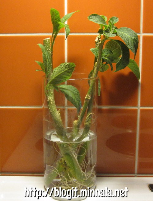 Sain Facebookin puutarharyhmästä testiin pasuunakukan alkuja. Lupasin niistä yhden naapurille, ja vaikkapa kaksikin. Kolme niitä alkuja tuolla maljakossa on nyt odottelemassa. Ja näistähän minulla ei ole minkään näköistä kokemusta aikaisemmin, eli kokeiluksi menee! Ei kun sitten vaan googlettamaan kasvatusohjeita… ja hankkimaan ensiksi hansikkaat, joilla tuota voi käsitellä. On kuulemma myrkyllinen. Suuri kasvuastia myös tarpeen.