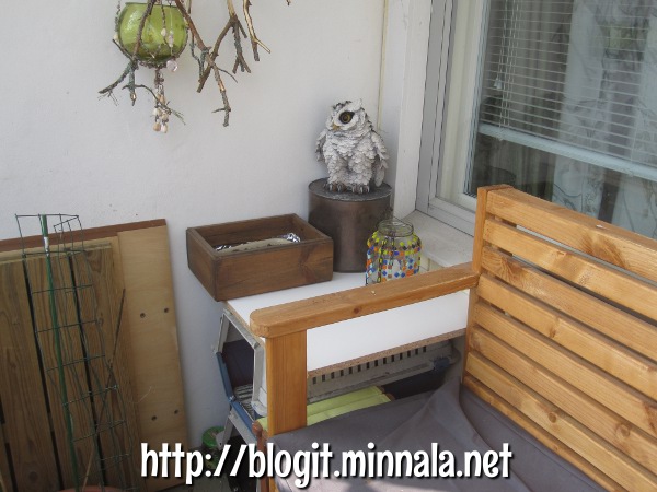 Päätin olla laittamatta tuolia tällä kertaa parvekkeelle, kun kalusteet ovat niin massiivisia, että paikat muuttuvat muutoin ahtaiksi. Tosin, tuolin voisi vielä laittaa nurkkaukseen toimittamaan pöydän virkaa… äh, katsotaan sitä asiaa sitten myöhemmin. Siirsin penkin parvekkeen toiseen laitaan. Kulmaukseen jäi juuri vopivasti tilaa pienelle pöydälle. En ole vielää päättänyt mitä sinne laittaisin, mutta ei sinne voi mitään ihmeitä laittaa, koska kulmaus on suurimman osaa päivästä varjossa. Tarkoitus on vielä laittaa kulmauksen edessä olevaan muovisäleikköön köynnöksiä kasvamaan auringonsuojaksi, niin sitä vähemmän kulmaus saa aurinkoa. Patsastelkoon siellä puutarhapöllö sen aikaa…