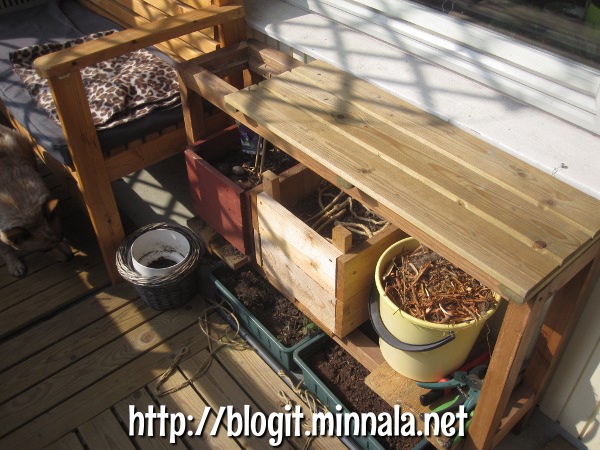Koska siirsin kukkapöydän tähän paikkaan, jää minulle hyllytilaa jonkin verran kasveja varten… tai mitä lie varten! Noh, ensimmäisenä kyllä tuli mieleen siirtää kärhö tähän (punaisessa laatikossa). Se oli tässä samaisessa hyllyssä viime kesänkin, mutta kasvoi hieman nihkeästi. Saattoi johtua siitä, että hylly oli parvekkeen kaidetta vasten, ja kasvuastia oli täysin varjossa. Hyllyn päälle saan myös pelargoniat, joita minulla on odottelemassa tuolla varastossa. Ajattelin laittaa hyllyn alle lattiatasolle lobelioita.