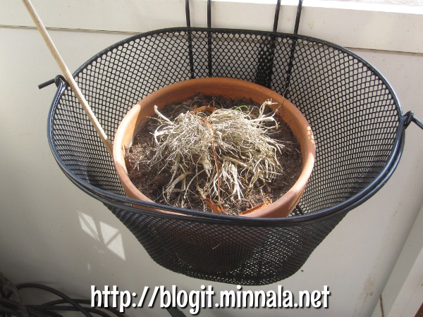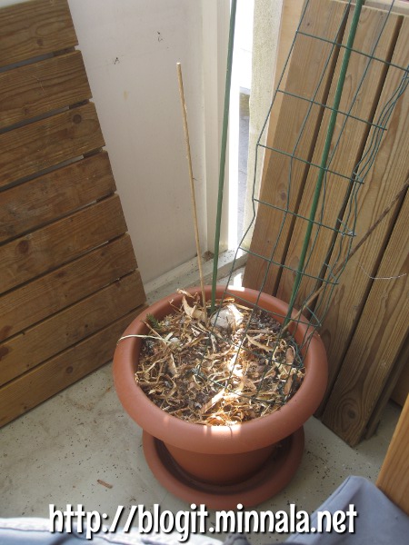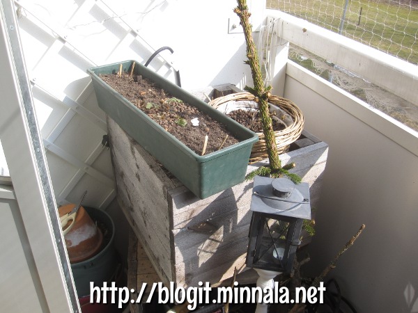 En käy talvella juurikaan parvekkeella. Välillä sitä unohtaa, mitä kaikkea sinne on tullut hankittua. Esimerkiksi, viime kesänä ostin tällaisen muovisen ruukun tomaatteja varten. Kun tänä vuonna en aikonut laittaa tomaatteja kasvamaan laisinkaan, jää tämä ruukku muihin tarkoituksiin. Olen vielä kahden vaiheella, mitä tähän istuttaisin – joko köynnöskasveja, tai sitten pasuunakukan. Saatan kääntyä pasuunakukan puoleen, koska muutoin minun pitää hankkia myös sille istutusruukku.