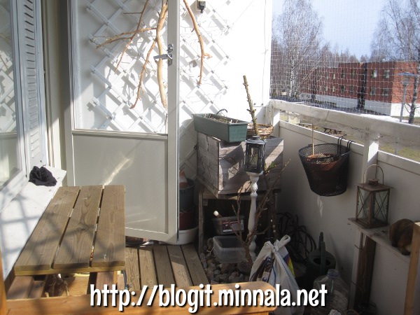Parvekkeesta tuli nyt paljon avarampi. Koska en laittanut penkkiä päätyseinälle, vaan jätin sen ikkunaseinustaa vasten, jäi sen viereen tyhjä tila. Siirsin kukkapöydän kaiteen vierestä siihen. Nyt penkin ympärillä on helpompi liikkua. Mietin tätä pitkään. Joskus voisi olla mukavaa istua parvekkeella sateellakin, niin tuli viime kesän aikana todettua, ettei tuohon nykyiseen paikkaan sada vettä laisinkaan. Ja kun kaiteelle eteen laitetaan vielä köynnökset kasvamaan, sitä vähemmän vettä tulee parvekkeen puolelle. Saatan kyllä vielä siirtää penkin ihan tuonne takalaitaan nurkkaukseen asti, jotta saan löhötä penkillä tyynyjen kera!