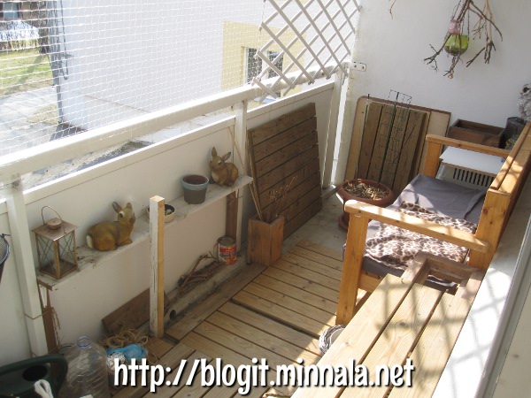 Tulee varmaan tänään jatkettua parvekkeen laittamista. Nyt siellä voi kuitenkin jo kävellä sukkasillaan puuulaattojen päällä, kun siivosin roskat lattialta pois. Tosin roskat ovat nyt muovipusseissa ja ämpäreissä odottamassa, että veisin ne pois… mutta tämä tästä tällä kertaa. Hyvää viikon alkua!